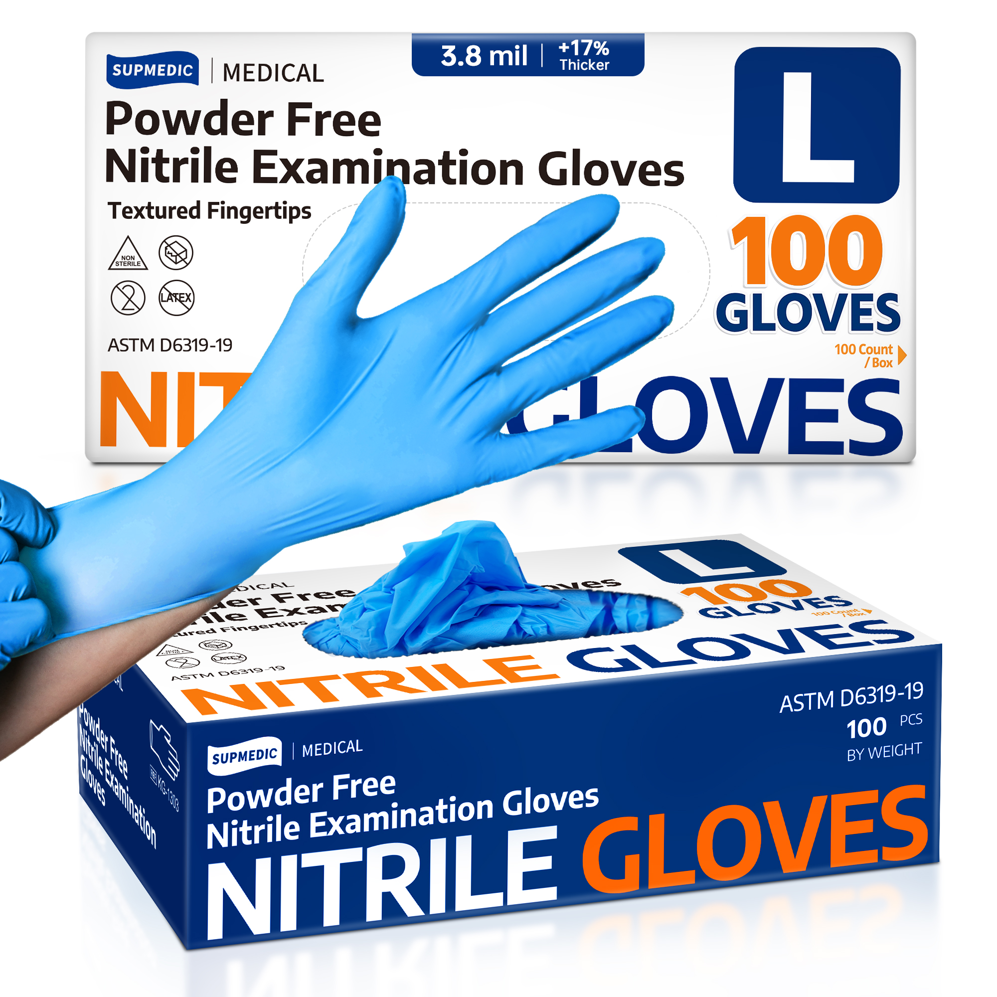 Supmedic Blue Nitrile Exam Glove, 3.5 mil, Disposable Medical Gloves, Box of 100 pcs (Large)